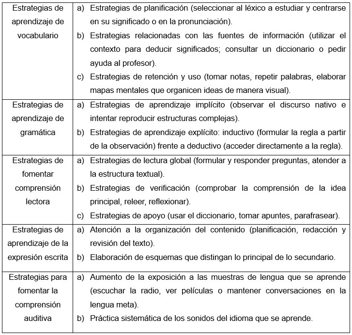 A lo largo del tiempo, se han propuesto diferentes clasificaciones de estrategias según diversos criterios. Natalia Alarcón, profesora del Departamento de Filología Hispánica y Clásica de la Universidad de Castilla-La Mancha, defiende la clasificación según las actividades de la lengua, que agrupa las estrategias empleadas para aprender vocabulario, gramática, desarrollar comprensión auditiva y lectora, así como expresión oral y escrita (tabla basada en Alarcón Mosquera, 2021):