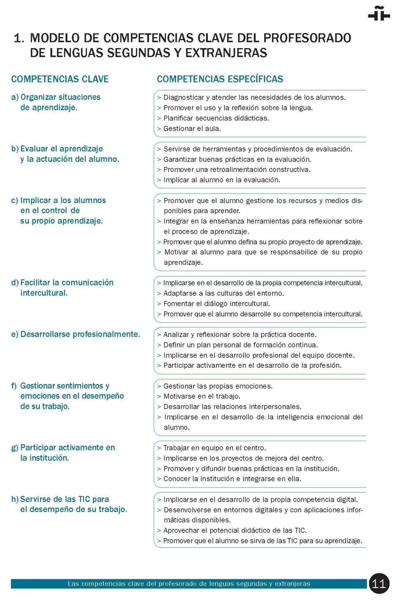 De acuerdo con el documento, elaborado por el Instituto Cervantes, las competencias del docente de lenguas segundas y extranjeras se entienden como la capacidad de poner en práctica los conocimientos teóricos para dar una respuesta eficaz a las situaciones a las que se enfrenta en su actividad profesional. Hay ocho competencias centrales, cada una de las cuales incluye cuatro competencias específicas (Las competencias clave del profesorado de lenguas segundas y extranjeras, 2018, p. 7, 11):